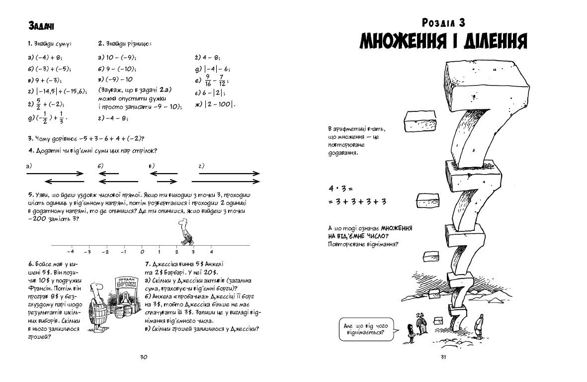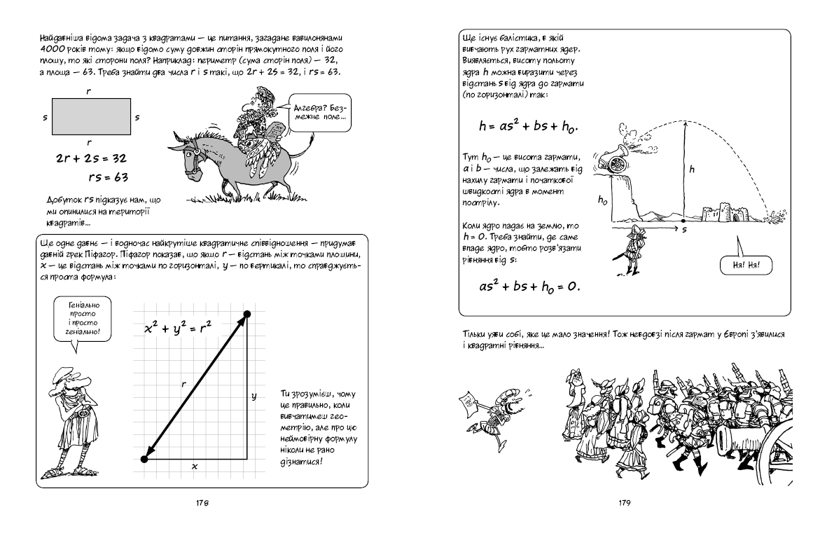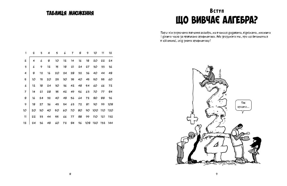 Нова книжка відомого карикатуриста Ларрі Ґоніка, що вивчав і викладав математику в Гарвардському університеті, — це цікавий курс алгебри, що охоплює основні теми шкільної програми, зокрема лінійні рівняння, многочлени, квадратні рівняння і побудови графіків.