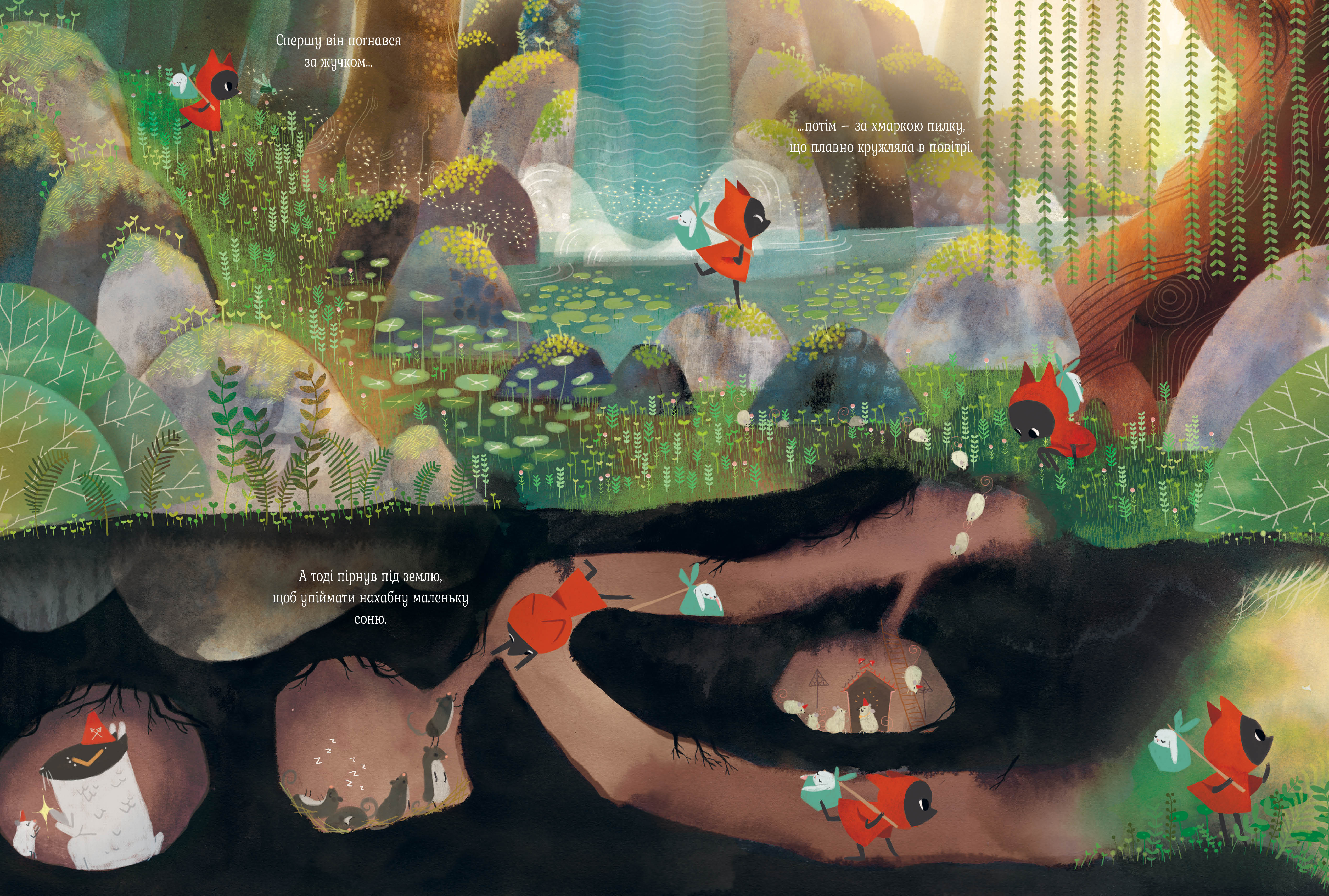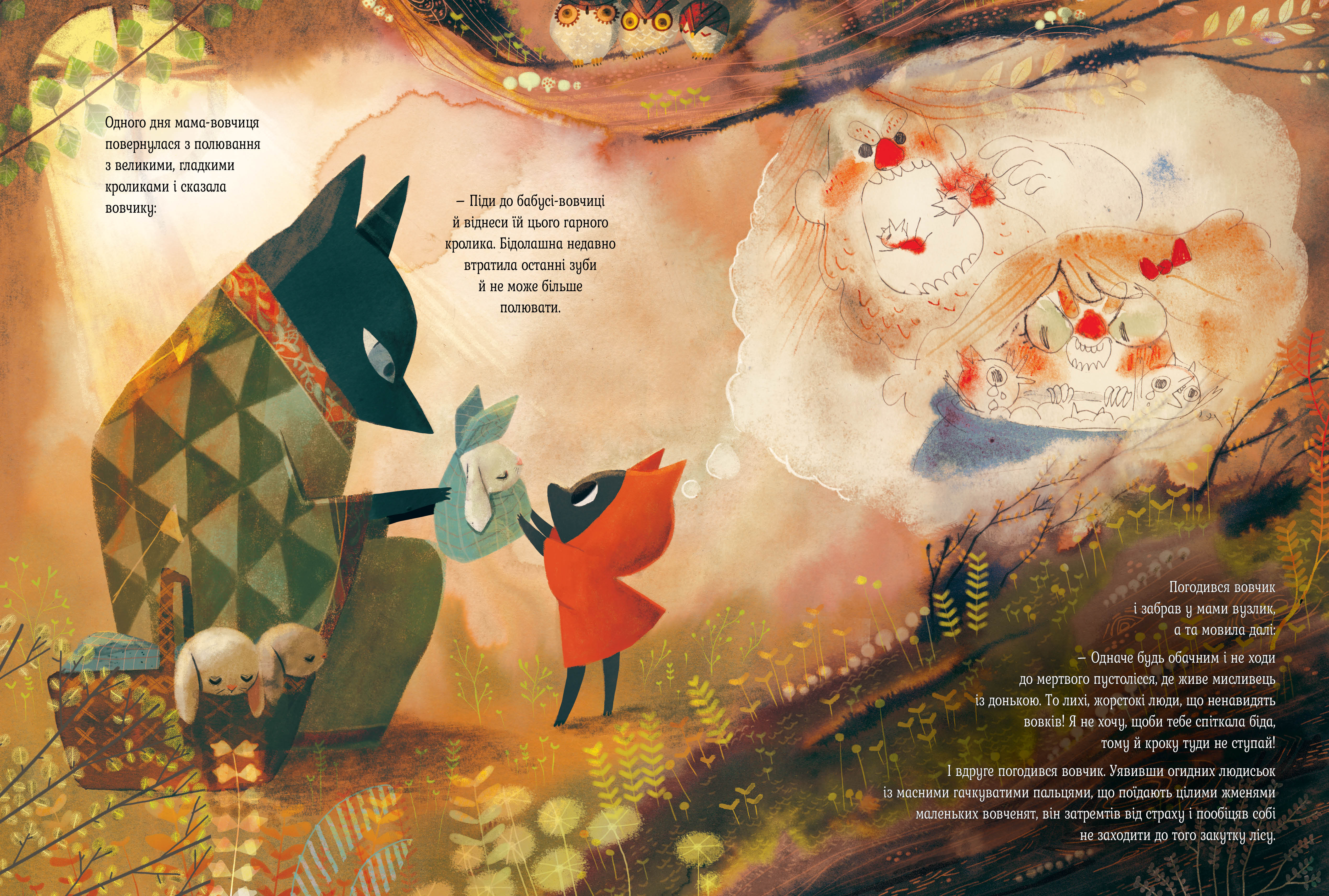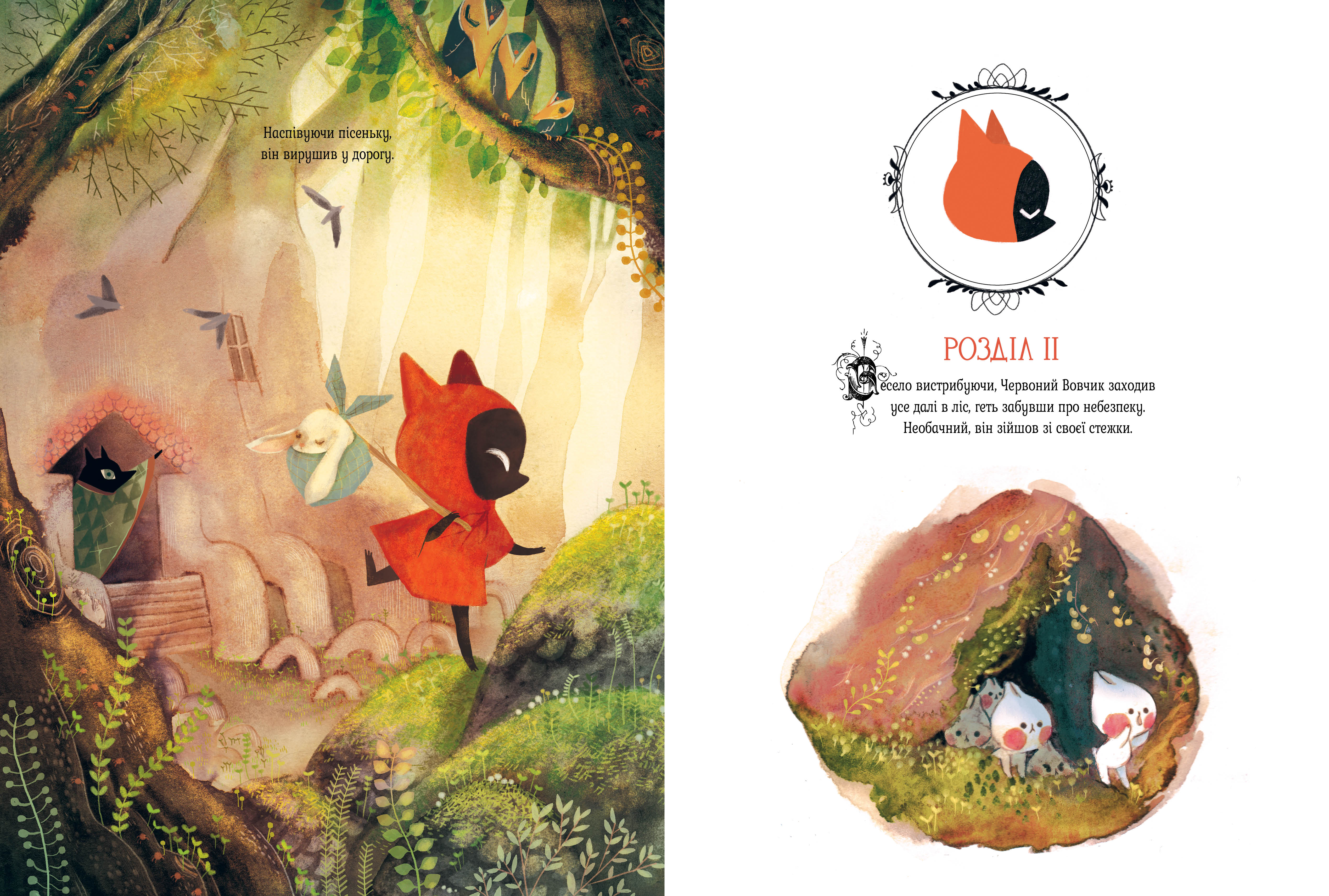 – Чому ти плачеш? Червоний Вовчик озирнувся. На нього зацікавлено дивилася маленька, дивно вбрана білява дівчинка. Розгубившись, вовчик згадав, чого його завжди вчили старші – «триматися подалі від людей!» Але маленька людина, що стояла перед ним, здавалася такою доброю і тендітною, що він миттю відчув до неї довіру.