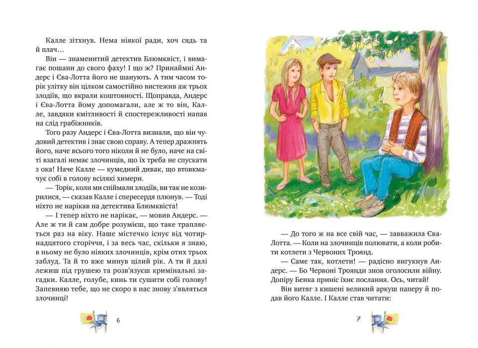 У захопливій другій книжці діють як уже знайомі, так і нові герої. Бути детективом — це чудово. Але й про друзів і розваги забувати не годиться, та й у місті так спокійно! Калле вирішив тимчасово облишити деякі детективні справи — оголошено війну Червоної та Білої Троянд. І веселе товариство невгамовних дітей вирушає у справжнісінькі Прерії, просто за містом, де відбуваються поєдинки лицарів і облоги замків, а об’єктом пошуків стають секретні карти. Проте через жахливу знахідку Єви-Лотти доводиться припинити гру, і Калле знову мусить розгадати страшну таємницю...