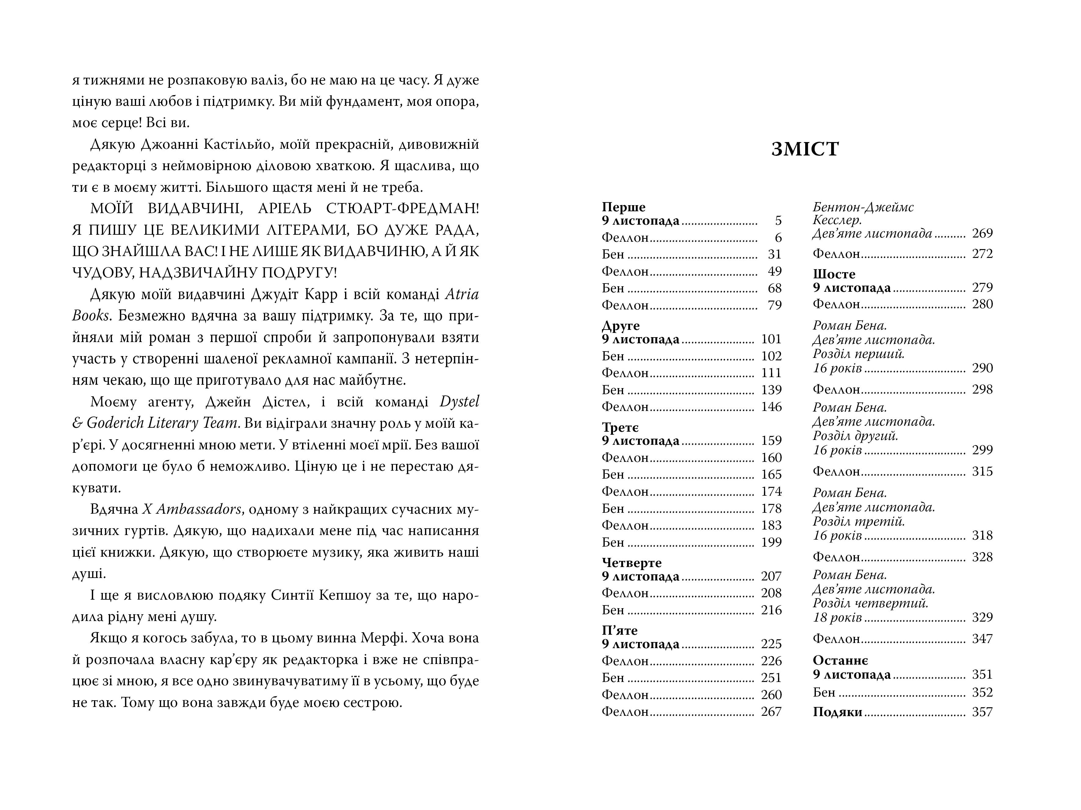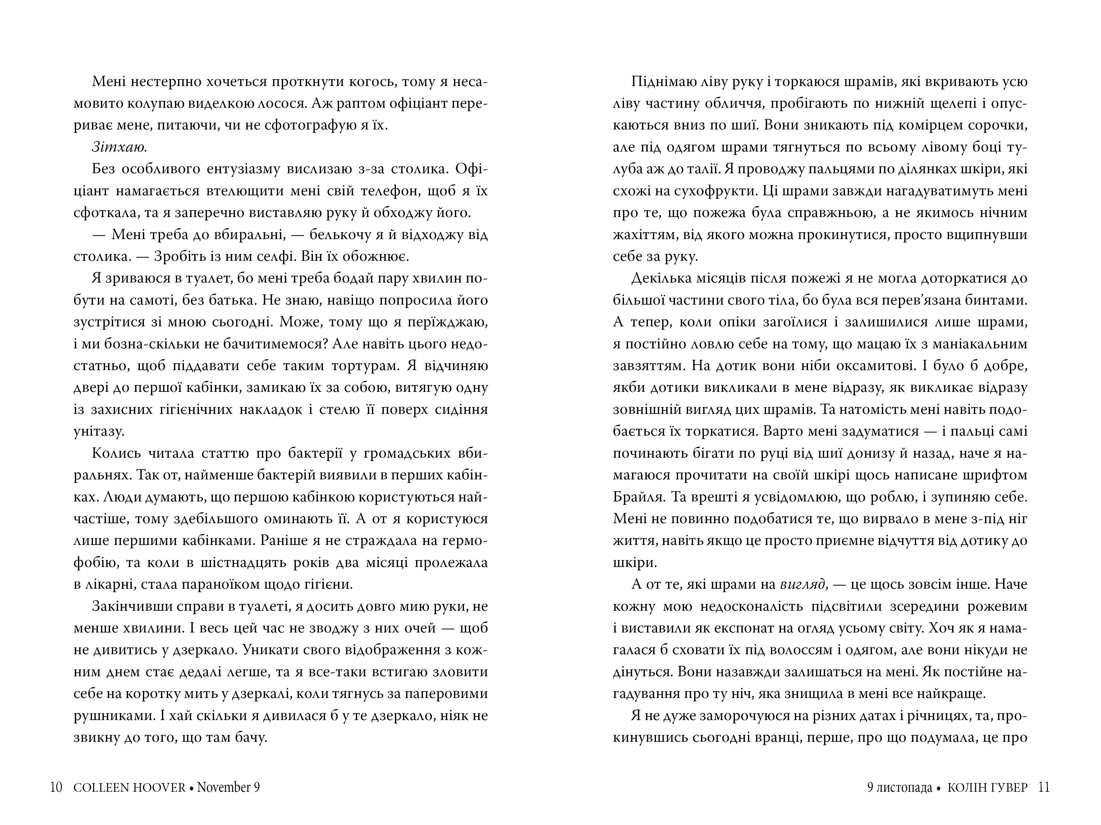 - «"9 листопада" – ще один захопливий роман Коллін Гувер, наповнений хвилюванням, динамікою та душевним болем. Я любила кожну сторінку та дихала кожним словом», – Анна Тодд, авторка серії «Опісля».