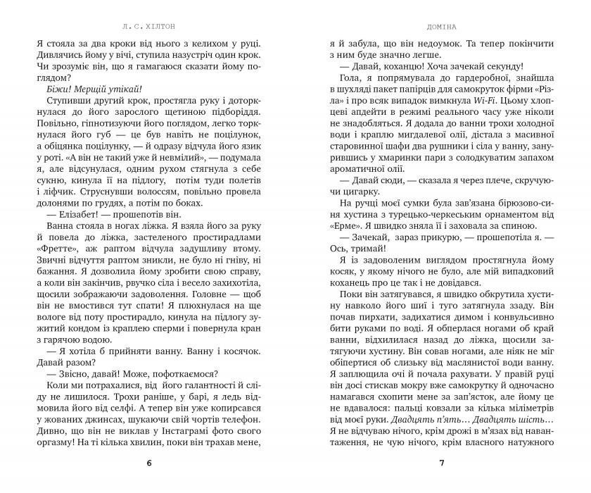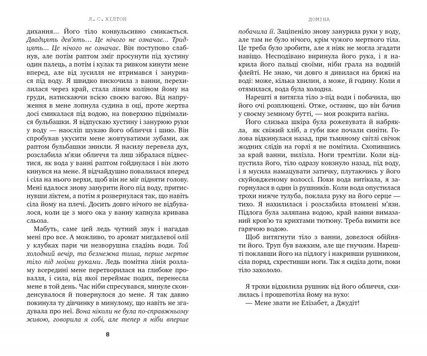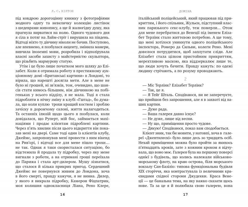Письменниця Л. С. Хілтон новим романом «Доміна» продовжує нещадно препарувати старі як світ суспільні пороки й навколомистецькі реалії, не приховуючи жодної «родимої плями». На власне мистецьке полювання виходить і головна героїня відомого роману «Маестра» Джудіт Решлі, але в не менш напружено-психологічному його продовженні «Доміна» вона вже змінює і «прописку», й ім’я, і власну личину і, як титулована власниця галереї «Джентилескі», її розпорядниця-domina, вдихає на повні груди важкувато-млосне, аж до запаморочення, повітря справжньої перлини Адріатики — неповторної