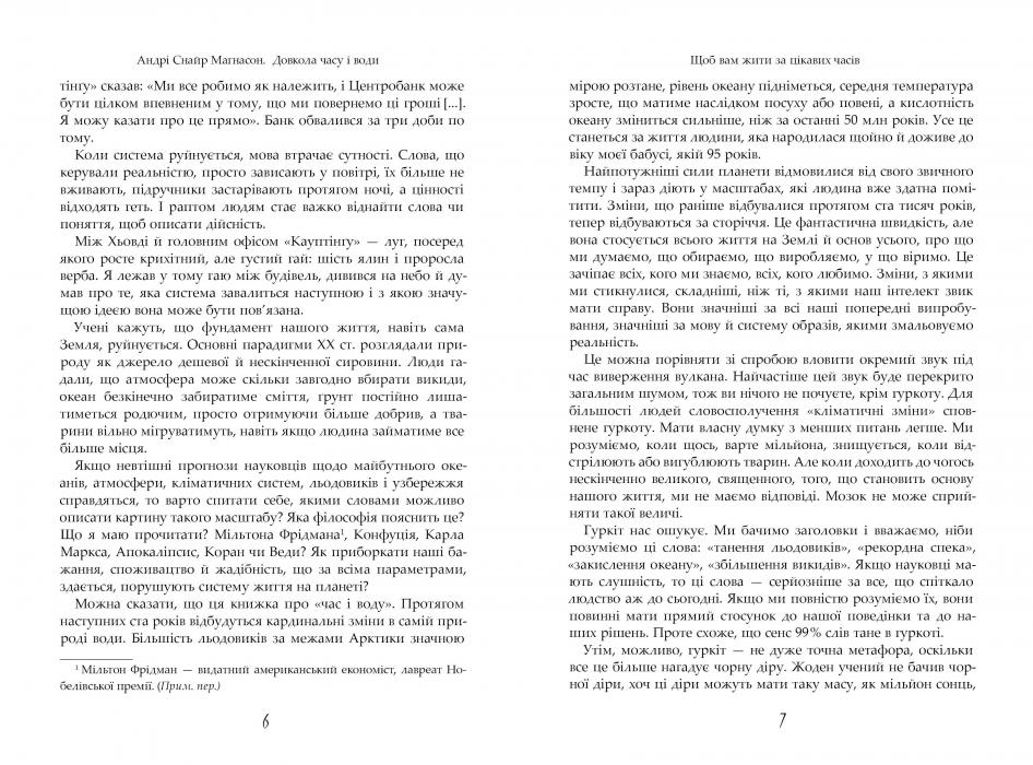 - «Погляд Андрі Снайра Маґнасона на довкілля власної країни є унікальним та переконливим... Автор намагається зрозуміти і допомогти читачеві зрозуміти, чому кліматична криза не сприймається як окрема трансформаційна подія, як, скажімо, падіння Берлінської стіни або теракт 11 вересня 2001 року. Основною проблемою, як з’ясовує ця книга, є час. Зміна клімату – катастрофа в повільному темпі, і все ж "повільна" – це набагато швидше, ніж багато людей здатні усвідомити», – The Economist.