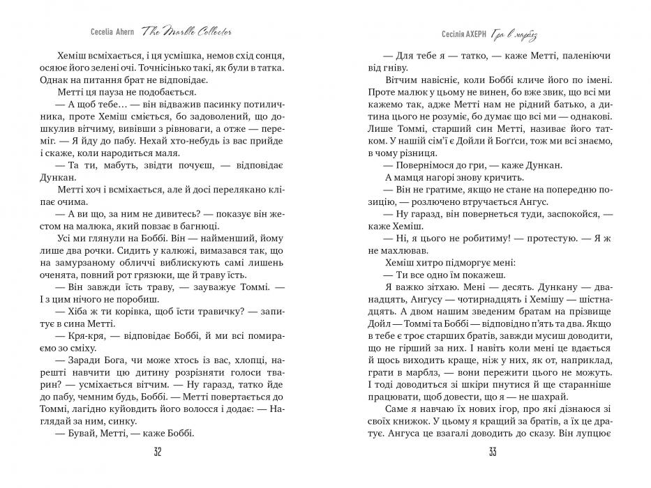 «Гра в марблз» — роман про те, як наші звичні вчинки спричиняють неймовірні наслідки, про те, що тільки зрозумівши рідних, ми по-справжньому зрозуміємо самих себе.