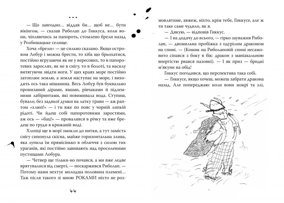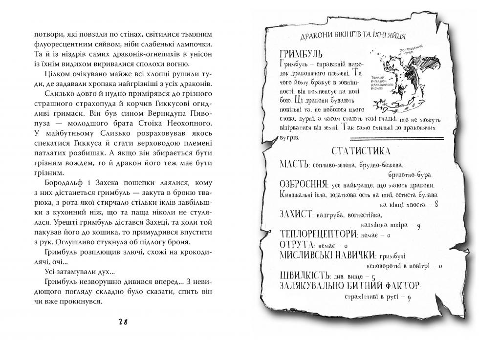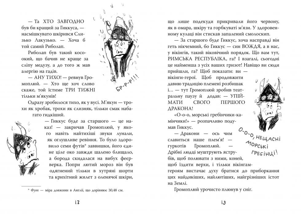 Ви, може, не знаєте, та колись кожен вікінг мав власного дракона. Інші народи приручали собак, коней, буйволів... А вікінги — драконів. Однак юний вікінг спершу мусив упіймати собі дракона. Це було непросто. Потім — приручити його, а це ще складніше. Усе разом називають випробуванням драконячим вихованням. Того, хто його не пройде, виганяють із племені.