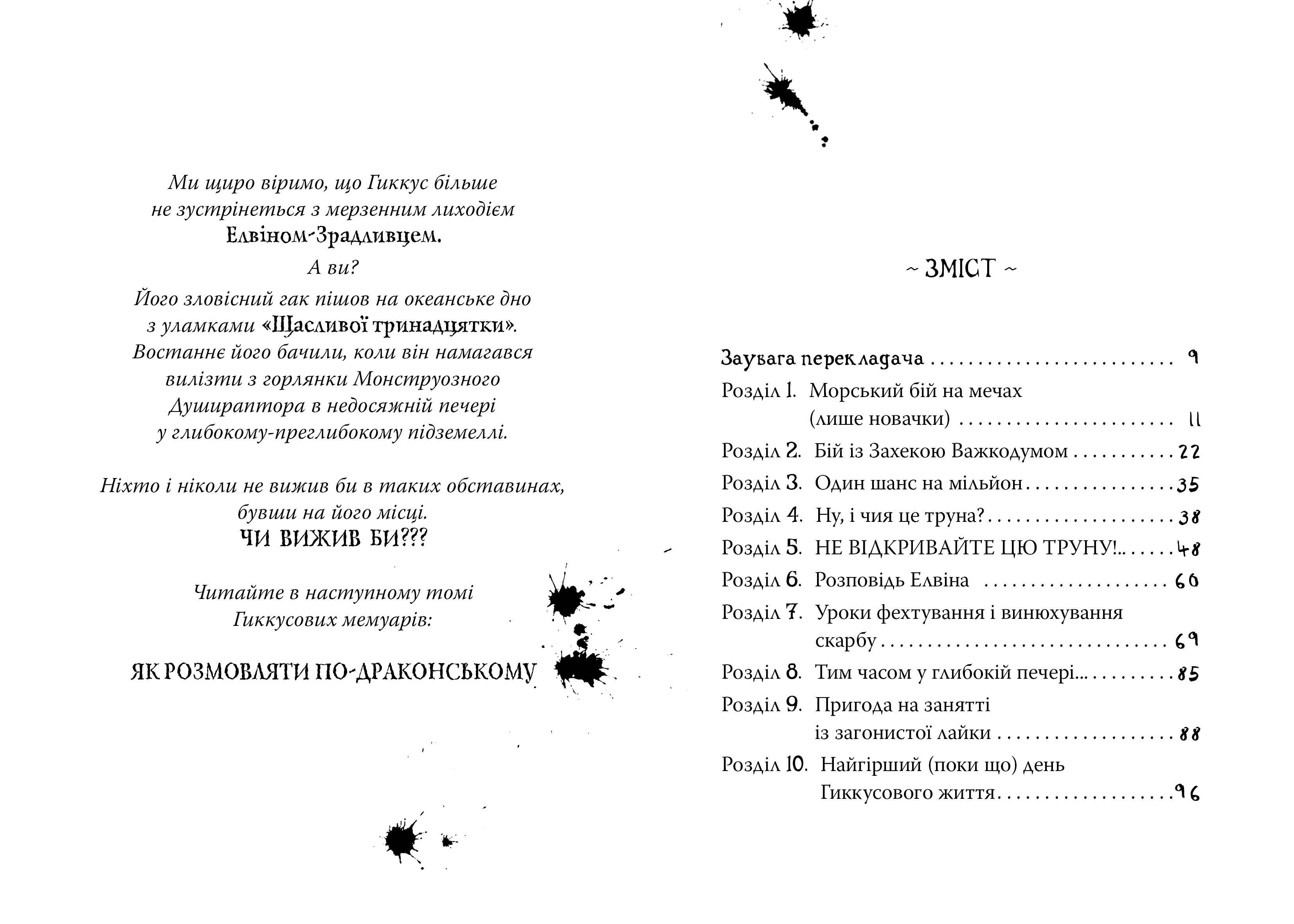 «Ми — вікінги. А це робота небезпечна!» — говорив герой популярного мультфільму «Як приборкати дракона», створеного за мотивами серії книжок Крессиди Ковелл. Читаючи другу з них, ви переконаєтеся, що бути вікінгом справді нелегко. Адже справжній вікінг має не тільки приручити і вимуштрувати дракона, а й опанувати ремесло пірата. Серед патлатих розбишак було чимало відважних піратів. Та найзнаменитіший серед них — Страхун Злобородий, прапрадід Гиккуса Страхітного Окуня ІІІ (Третього). А тепер уявіть, що ви натрапили на слід незліченних скарбів Страхуна Злобородого. Хіба напис «НЕ ВІДКРИВАТИ!» вас зупинить?! Проте Гиккуса цей напис нажахав. Хлопцю здалося, що станеться лихо. Та в племені ніхто його не почув. Тож патлаті розбишаки знову вскочили в халепу, а рятувати всіх довелося Гиккусові. Усіх і себе! Усе-таки це нелегко — бути героєм-вікінгом.