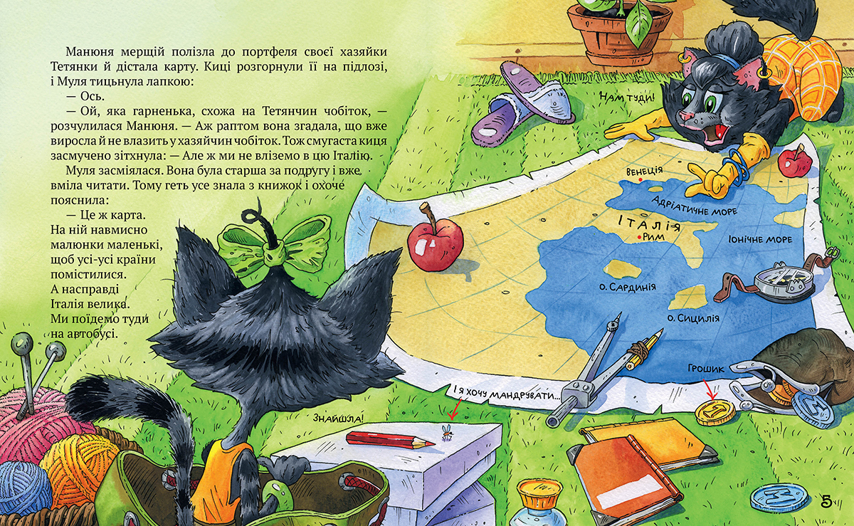Киці Муля і Манюня так люблять мандрувати! Не подумайте, що на сусідню вулицю, ні! До інших країн! І в кожній з кицями стаються неймовірні пригоди. Хочете помандрувати разом з ними? Читайте про Мулю і Манюню в Італії, Гренландії та Фінляндії!