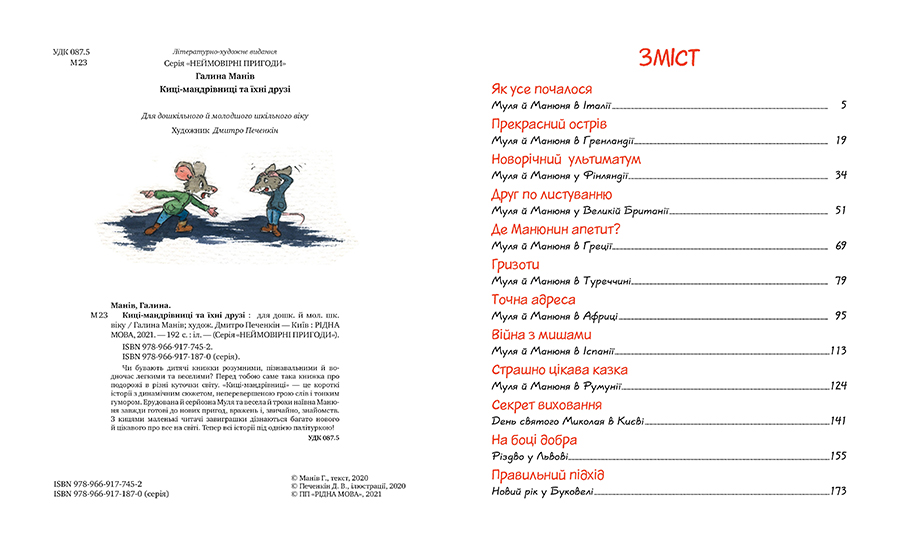 Чи бувають дитячі книжки розумними, пізнавальними й водночас легкими та веселими? Перед тобою саме така книжка про подорожі в різні куточки світу. «Киці-мандрівниці» — це короткі історії з динамічним сюжетом, неперевершеною грою слів і тонким гумором. Ерудована й серйозна Муля та весела й трохи наївна Манюня завжди готові до нових пригод, вражень і, звичайно, знайомств. З кицями маленькі читачі завиграшки дізнаються багато нового й цікавого про все на світі. Тепер всі історії під однією палітуркою!