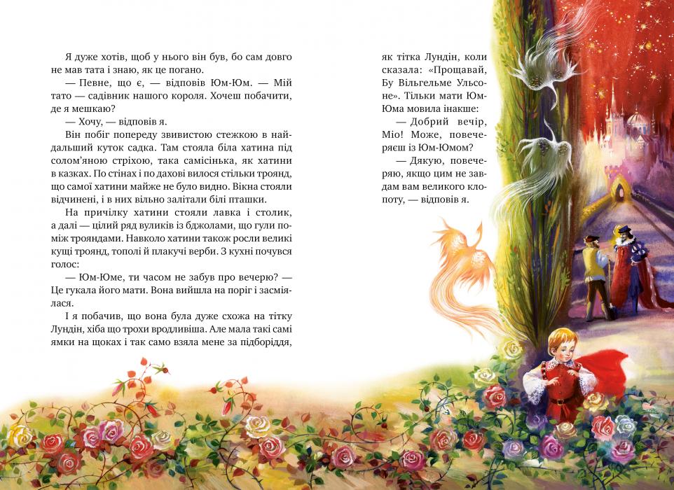 Добре, коли в дитини є і тато, і мама. А якщо дитина — сирота? Коли вона самітна і нестерпно самітна, як-от дев’ятирічний Буссе, головний герой казкової повісті Астрід Ліндґрен? Тоді уява може запросто перенести хлопчика в Країну Далеку, де король — це його тато, а сам Буссе, як з’ясувалося, — справжній принц, Міо.