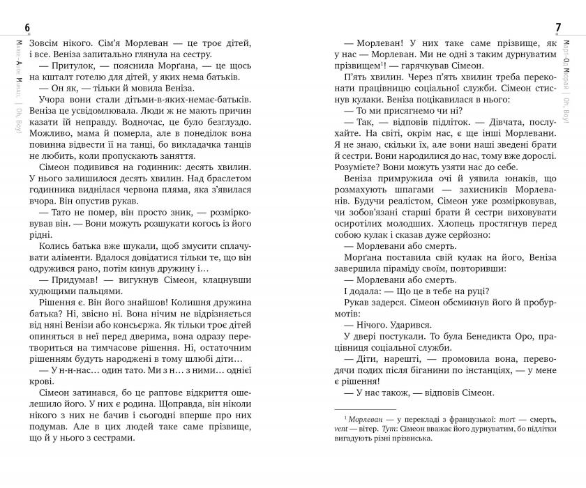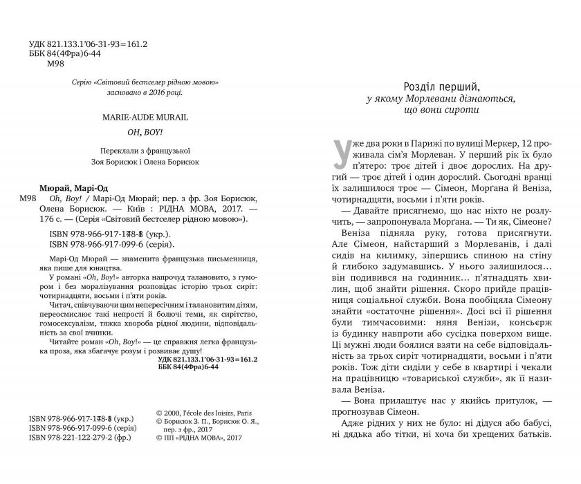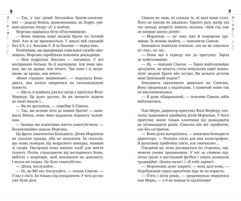 У романі «Oh, Boy!» авторка напрочуд талановито, з гумором і без моралізування розповідає історію трьох сиріт: чотирнадцяти, восьми і п’яти років.