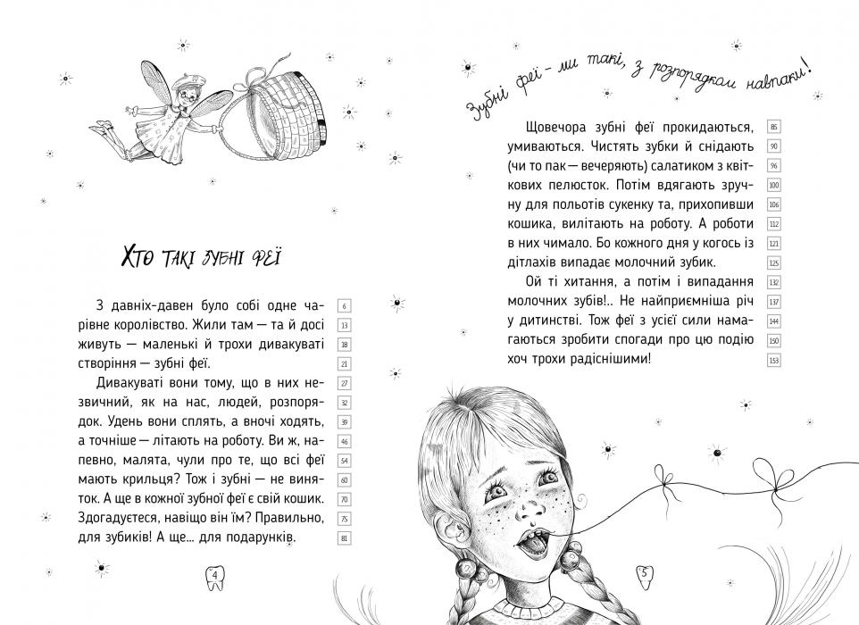 «Оповідки зубної феї» — це короткі, але дуже цікаві історії від найталановитішої в світі чарівниці! Наприкінці кожної історії — запитання, відповівши на які, ти отримаєш від мами (чи того, хто вчить тебе читати) заслужене #оце–молодець! Числа наприкінці рядочків — це кількість прочитаних тобою слів. Тож дорослі можуть швидко порахувати, скільки слів ти читаєш за хвилину. Кілька спроб — і он як ти вже тарабаниш! І зауваж — ніякої магії! Ну хіба зовсім трішки, адже оповідачка — справжня фея!..