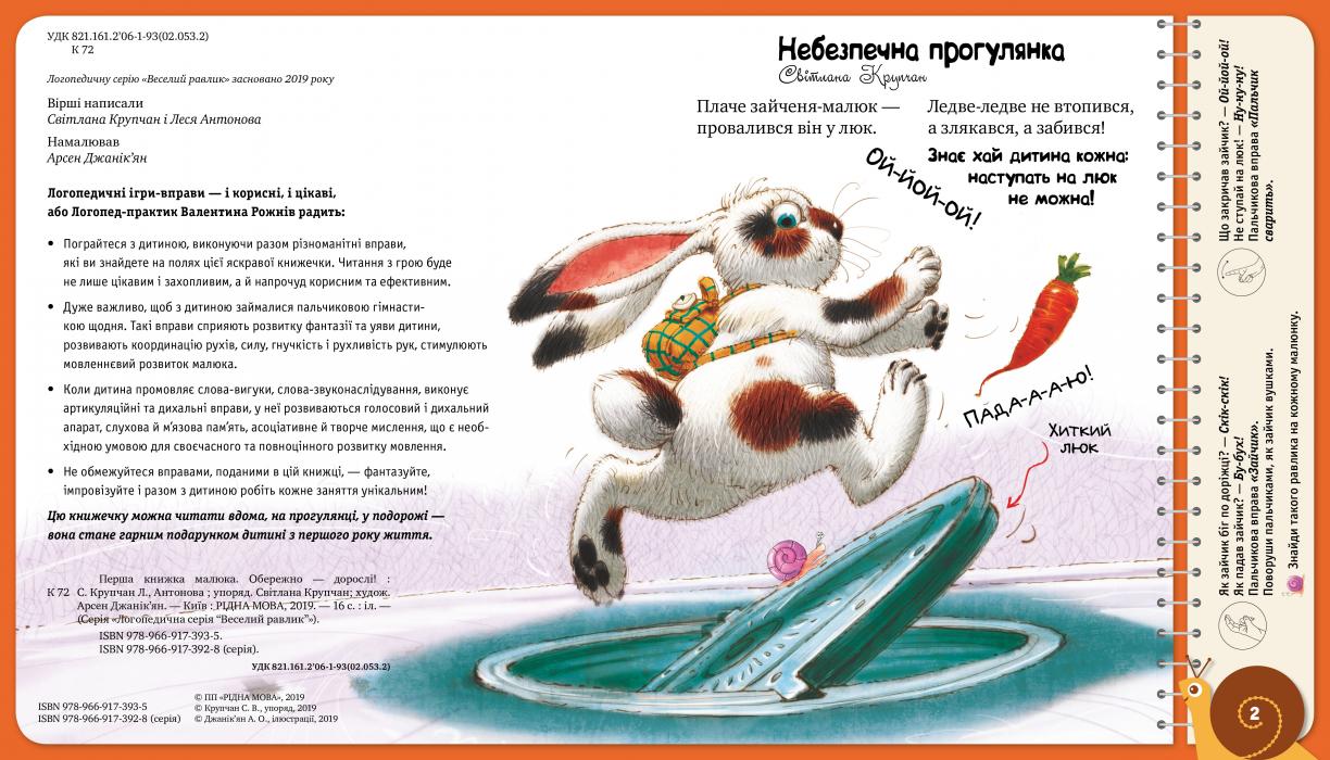 У сім’ї, де є маля, батьки насамперед мусять зробити дитячий простір безпечним. У збірці «Обережно — дорослі!» кмітливі, але непосидючі звірятка раз у раз наражаються на небезпеку. На щастя, на допомогу завжди приходять дорослі — і все, звичайно, закінчується добре. Отож левенятко тепер пам’ятає, що в пісочниці трапляються гострі предмети, а пандочка — що ножем можна порізатися, кошенятко — що гарячою праскою можна обпектися і буде боляче… А разом з ними безпечної поведінки вчаться і маленькі читачі.