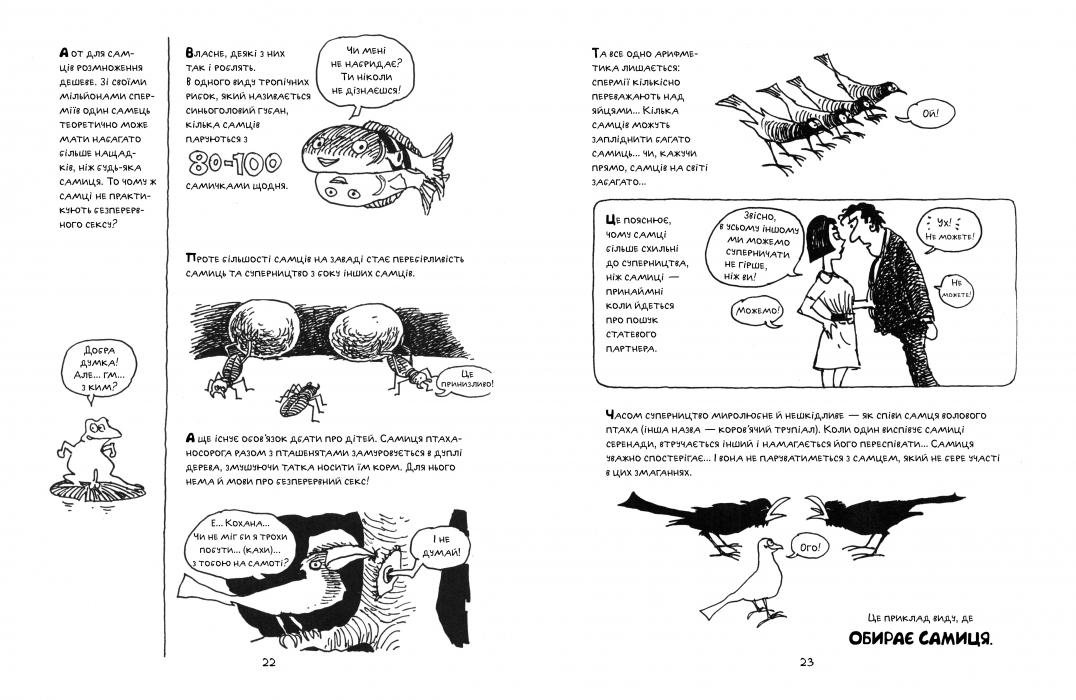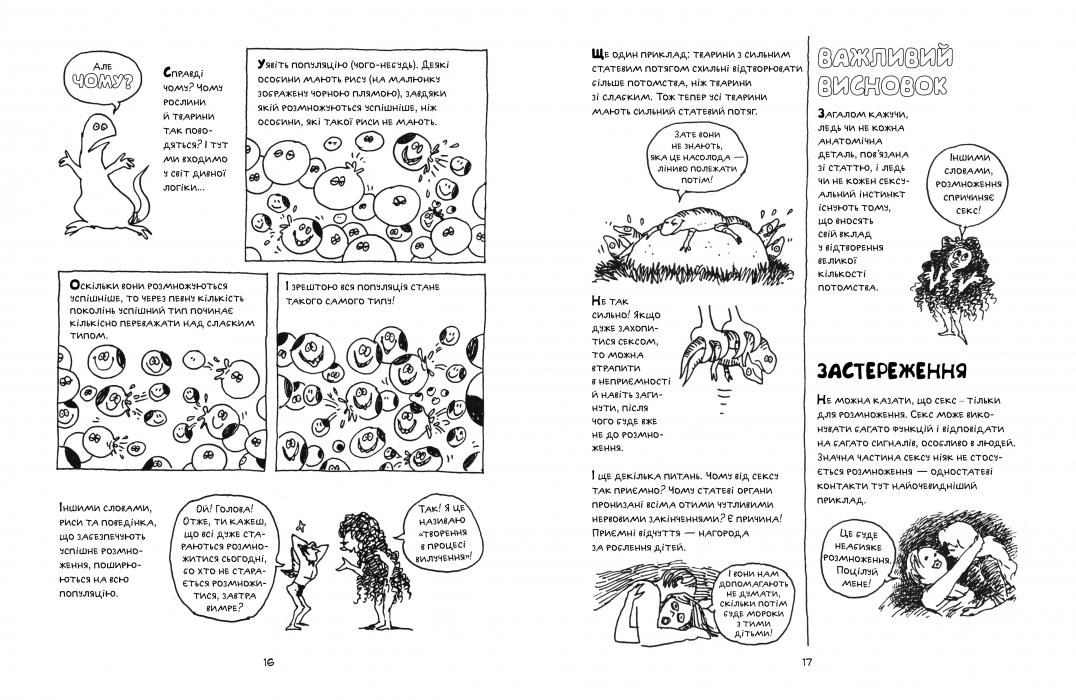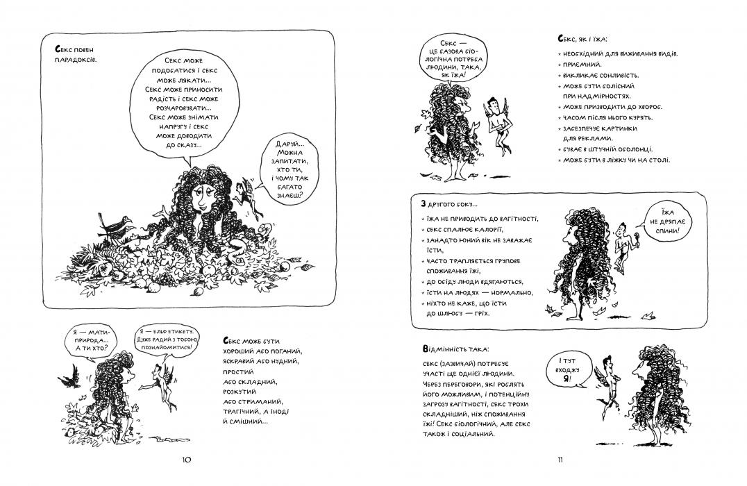 Ця книжка розвіює чари таємничості і водночас розганяє хмари вульгарщини, якими віддавна оповитий секс. Добрий порадник майже з усіх питань людської сексуальності. Дуже інформативний і смішний. Просвітить і старих досвідчених зубрів, і початківців. Тут є про бджілок та про рибок, але є й набагато глибше проникнення в тему. Що ми знаємо, як воно діє, що й чому ми при цьому відчуваємо, і як робити, щоб було тільки добре й не доводилося після приємного плакати. Кохання, шлюб, випадкові зв’язки, безпечний секс — усе описано дотепно та з науковою достовірністю. Авторський задум утілено в одному з найпопулярніших книжкових жанрів — коміксі.