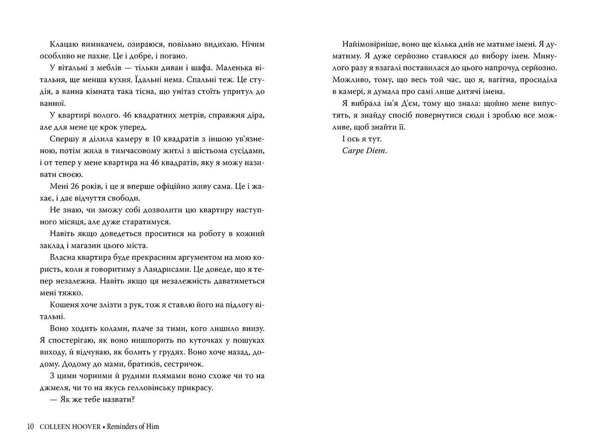 - «Новий роман Коллін Гувер розірве вас на шматки і знову склеїть… Емоційний шедевр про втрату та надію, горе та прощення, а ще про те, як сила кохання може зцілити», – Popsugar.