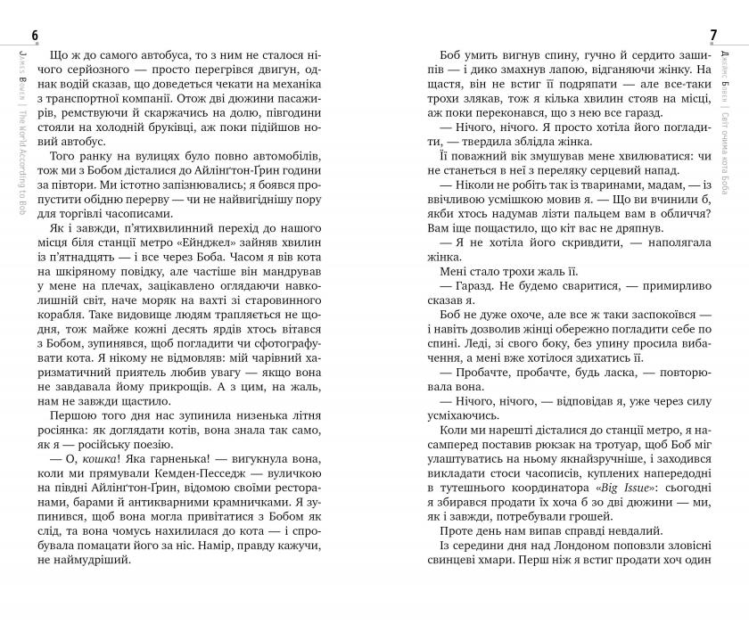Може здатися, що нова повість Джеймса Бовена «Світ очима кота Боба» — тривіальна історія про рудого вуличного кота й колишнього наркомана. Проте в усіх кумедних і сумних епізодах читач бачить людину, яка, навіть попри трагічний збіг обставин, прагне стати ліпшою. Автор розповідає про те, як був складним підлітком, як «підсів» на зілля, як десять років поневірявся в Лондоні та як рудий вуличний кіт допоміг йому здолати згубну звичку і віднайти віру в себе та людей.