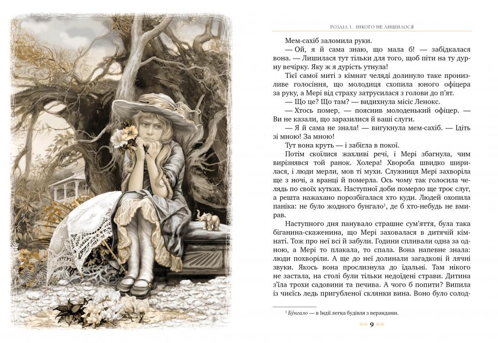У безберегому книжковому морі не так і багато життєствердних і світлих книжок. Перед вами — саме така: історія на всі часи для дітей і дорослих, яким варто частіше згадувати своє дитинство. Класика англійської літератури — роман Френсіс Бернет «Таємний сад» — відкриває бездонні глибини письменницької фантазії, захоплює і спонукає до роздумів!