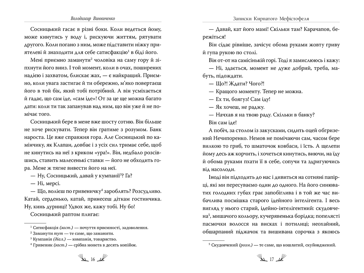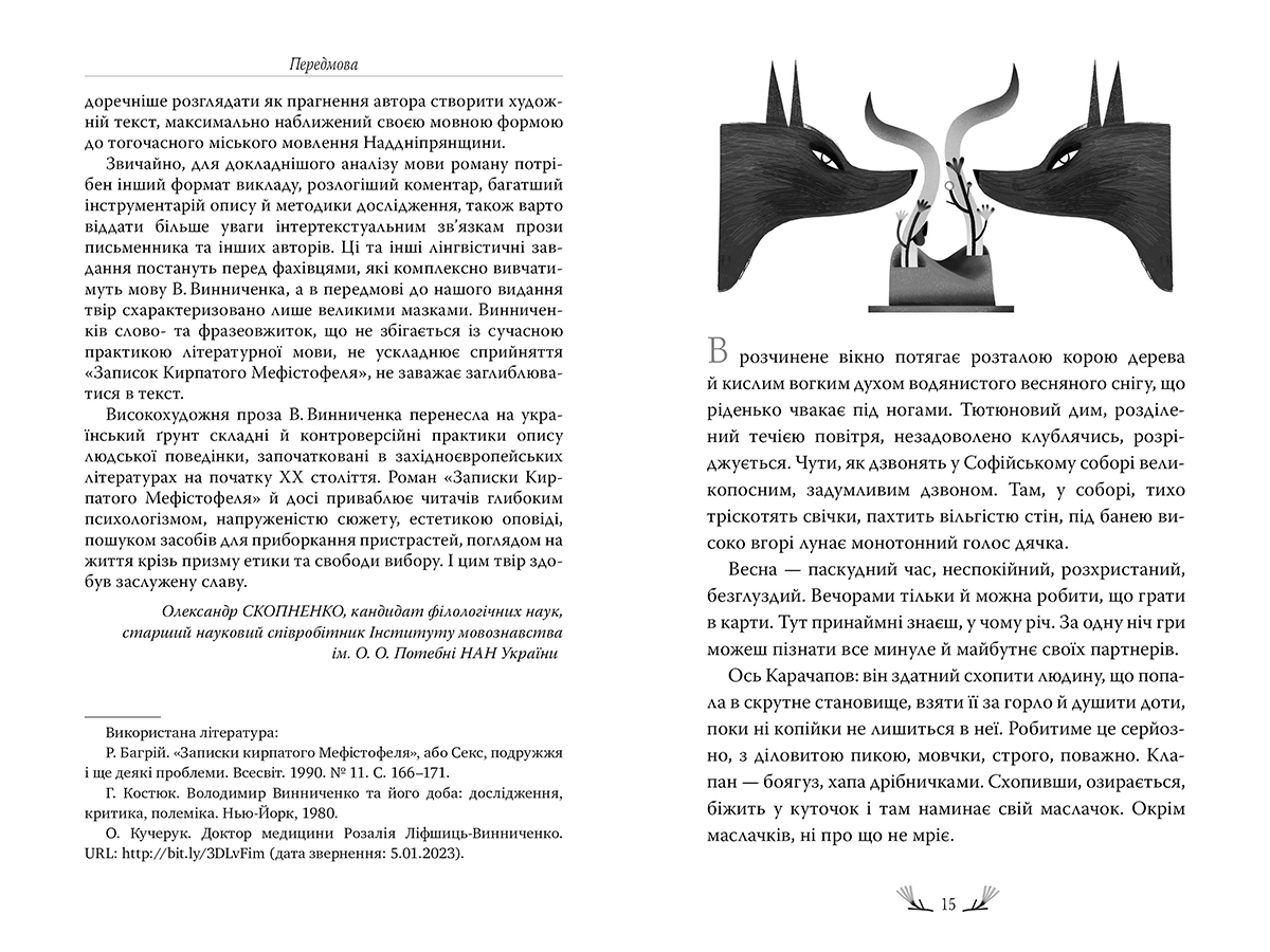 Володимир Винниченко в романі «Записки Кирпатого Мефістофеля» досліджує питання розуму й інстинкту, сім’ї та розлучення, опіки над дітьми й абортів, обов’язку та особистих бажань, закоханості й любові, високих поривань і загрузання в болоті повсякденності. Тонкий психологізм роману ставить його на один щабель із безсмертними творами світової класики.